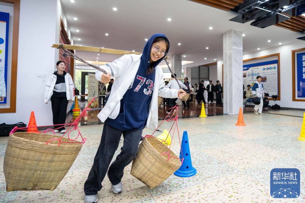↑ 3月19日,学生在湖南农业大学参加农趣运动游戏——竞速搬运。