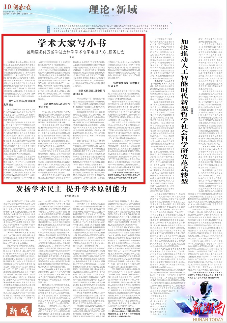破解供需矛盾,拓宽学术服务维度。当前,哲学社会科学领域存在“学术圈内热、社会层面冷”的供需错位问题,人民群众对高质量精神文化产品的需求得不到充分满足。学术大家写小书正是破解这一矛盾的有效路径,通过凝练思想内核、贴近大众话语、创新呈现形式,将高深学术转化为可亲近、可理解、可运用的公共知识,构建起学术发展与人民需求双向奔赴、相互滋养的良性生态,让学术成果服务于社会发展、满足人民需求。