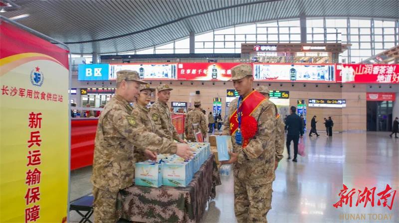 近日,长沙高铁南站候车大厅内,数百名新兵身着崭新戎装、胸佩大红花,整装待发,即将奔赴祖国各地开启军旅生涯。候车区的新兵运输保障点前,长沙军供站工作人员正将一份份定制 “能量包”,逐一送到新兵手中。