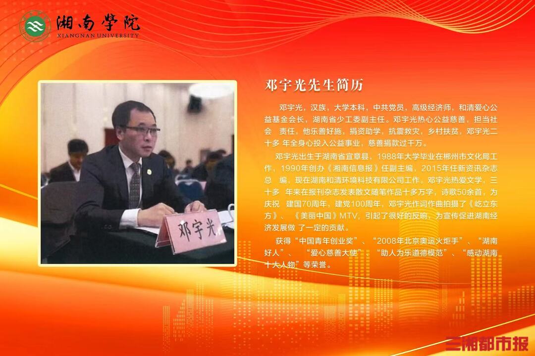 亲爱的同学、尊敬的老师们,大家下午好,我叫邓宇光,是一名公益志愿者,今天回到我的家乡,来到美丽的十八福地苏仙岭下的湘南学院,看到同学们,非常高兴,万分兴奋。但站在这讲台上,我又诚惶诚恐。我不是老师,不是来给同学们讲课的,而是和同学们分享一下我这么多年,一路走来的成长经历、人生故事、创业过程和公益慈善事业。