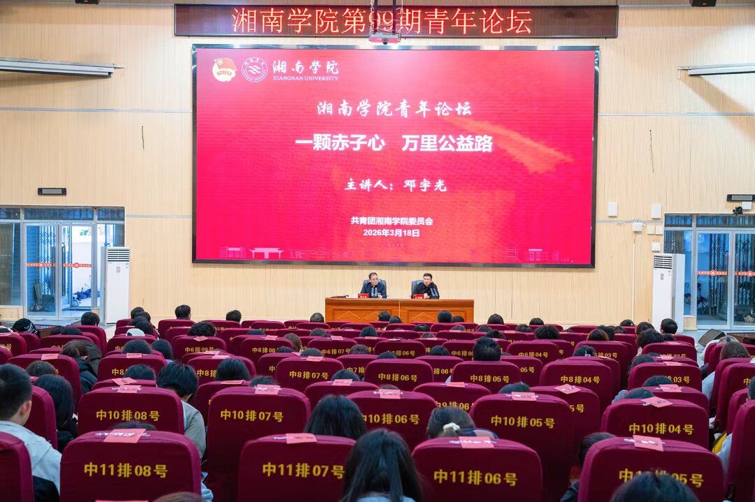 3月18日下午,湘南学院思政报告厅内座无虚席,第99期青年论坛在这里举行。本次活动特邀“感动湖南十大人物”、湖南省少工委副主任、公益慈善人士邓宇光先生,以“一颗赤子心,万里公益路”为主题,与现场师生分享他的成长经历、创业故事与公益人生。校党委书记邹宏如、副校长王雪峰出席活动,校团委全体人员、各二级学院团委书记及学生代表共同聆听了这场感人至深的分享会。