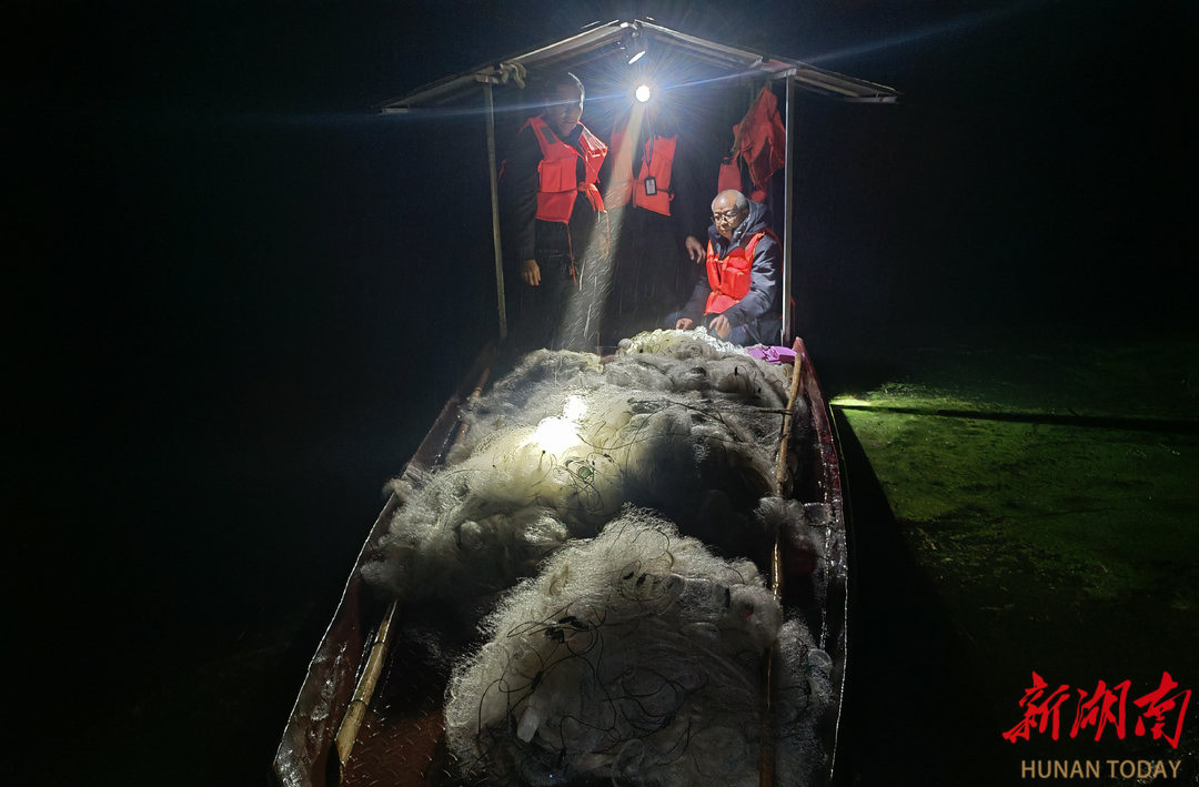 此次查获的非法渔网均为横库布设,单副长度超800米,5副渔网近4000平方米。执法人员顶着风雨、克服夜间视线不佳等困难,逐段拖拽拆解渔网,直至当晚11时许,全部违规渔具清理完毕。