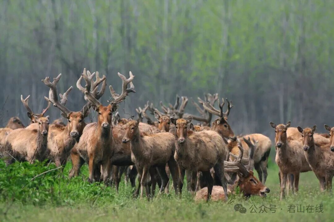 三十年来,君山区持续推进洞庭湖洲滩湿地修复,清理矮围围网、扩大麋鹿栖息范围、建立麋鹿救助繁育基地,为麋鹿营造了安全的繁衍环境。截至2025年,东洞庭湖野生麋鹿种群数量已突破320头,其中君山区境内稳定栖息的野生核心种群超280头,成为我国最大的自然野化麋鹿种群;君山麋鹿苑入选全省首批林业生物多样性体验地,110余头麋鹿在此繁衍生息,“呦呦鹿鸣,食野之苹”的诗意场景,在洞庭湖畔成为日常。