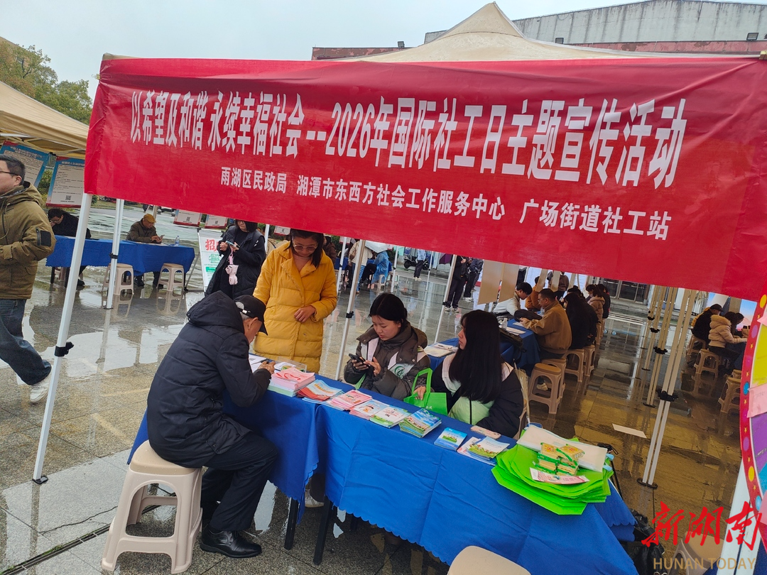 新湖南客户端3月20日讯(通讯员 朱菁菁 楚必良)3月20日,在湘潭市雨湖区民政局指导下,湘潭市东西方社会工作服务中心在2026年“春风行动”大型招聘会现场,开展“希望与和谐 共建幸福社会”国际社工日专题宣传活动。活动将社工宣传与求职服务场景深度融合,通过政策宣讲、互动问答、志愿者招募等形式,面向求职者及市民普及社工理念、宣讲民生政策,搭建起政策宣传与群众需求对接的便捷桥梁。