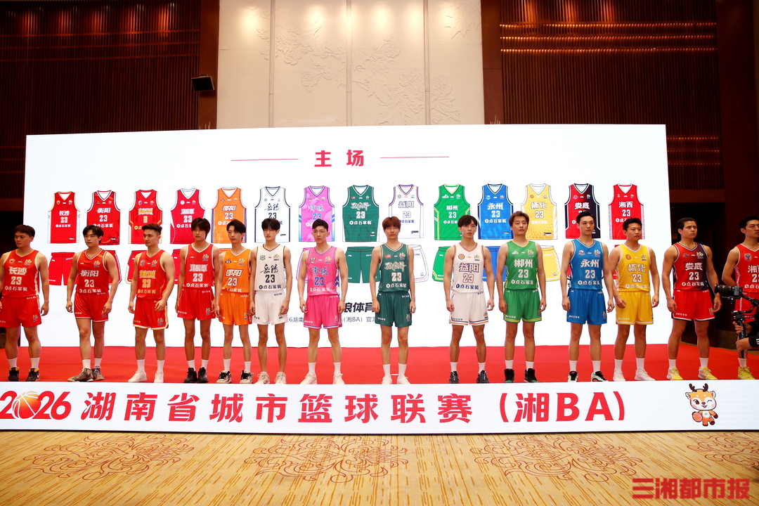 此外,本次推介会还展示了湘BA的 Logo、口号、吉祥物以及14个市州的比赛队服。其中,湘BA的Logo以湖南省简称“湘”与“南”字为创意核心,巧妙融合篮球运动的动感姿态,线条设计既似运动员运球突破的流畅轨迹,又如湘江奔涌向前的壮阔姿态,整体呈现出环抱篮球的造型,寓意全省14个市州以篮球为纽带紧密相连。湘BA赛事吉祥物“湘腾腾”,以麋鹿为原型打造。吉祥物以“走遍三湘四水,守护每一份热爱”为内核,身形灵动矫健、充满爆发力,鹿角象征得分高光,搭配湘绣护腕与联赛LOGO标识,整体形象热血阳光、接地气有韧性,传递草根篮球的纯粹热爱。