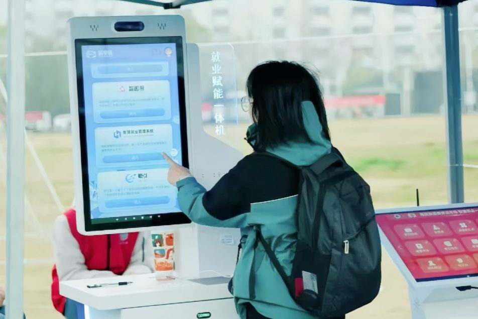 旁边的就业服务一体机实时滚动最新就业资讯与政策,就业赋能、生涯探索一体机则为学子开展专业职业生涯测评,帮助他们在海量信息中迅速识别到可以重点发力的岗位和求职方向。