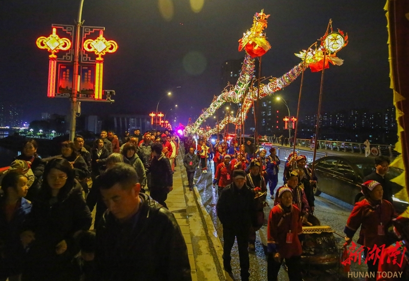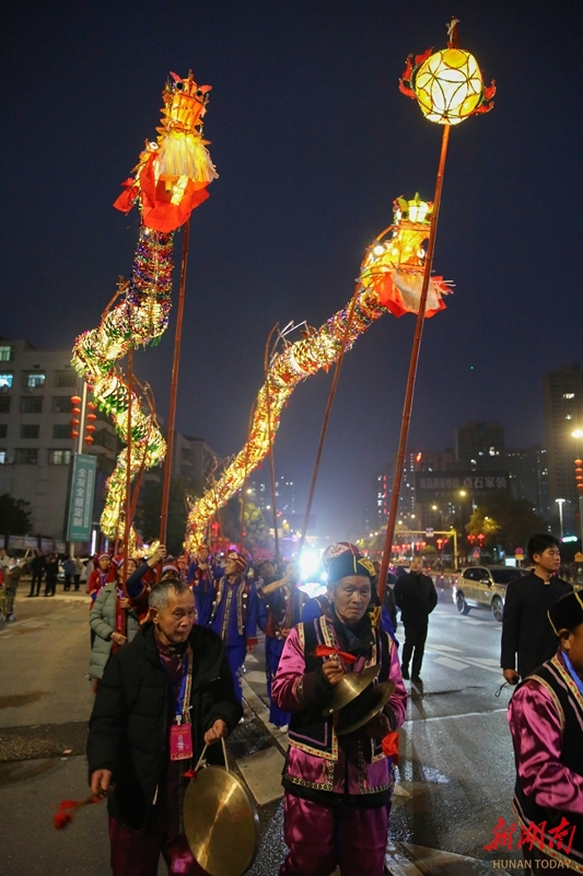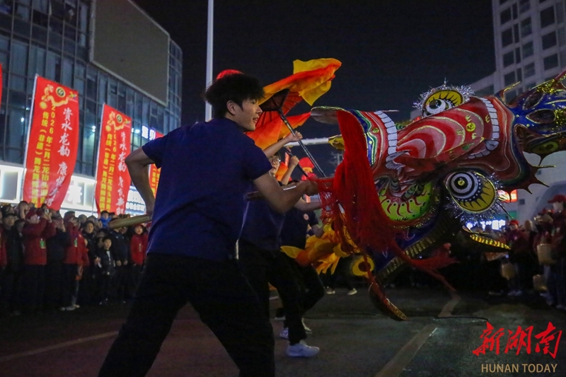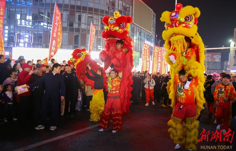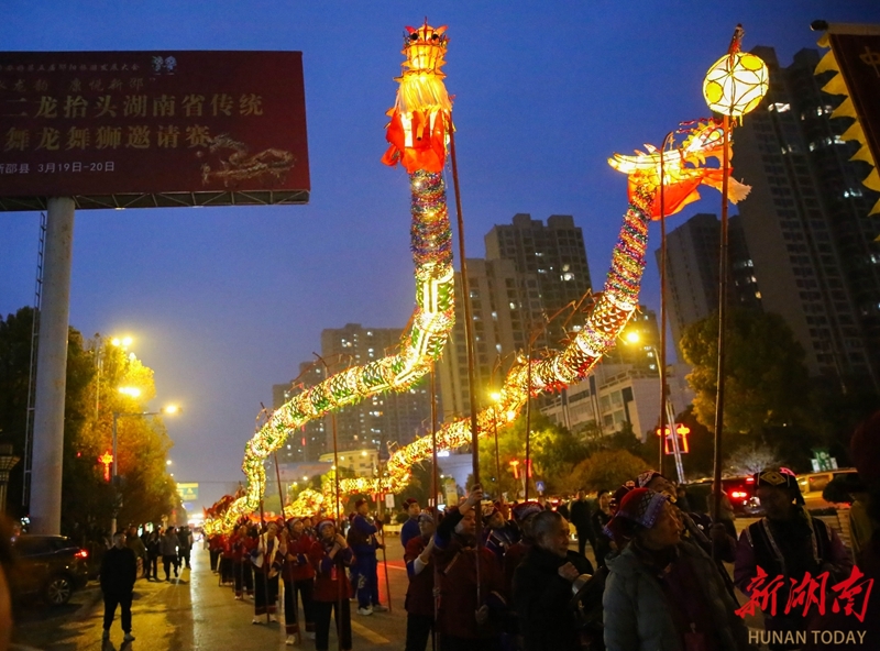 3月19日晚,“资水龙韵 康悦新邵”2026年湖南省传统(非遗)舞龙舞狮邀请赛暨民俗巡游活动在新邵县启幕。参赛龙狮队伍组成的巡游方阵一路展演,为市民献上了一场极具传统韵味的民俗文化大餐。曾勇 孙中坤 摄影报道(湖南图片库)