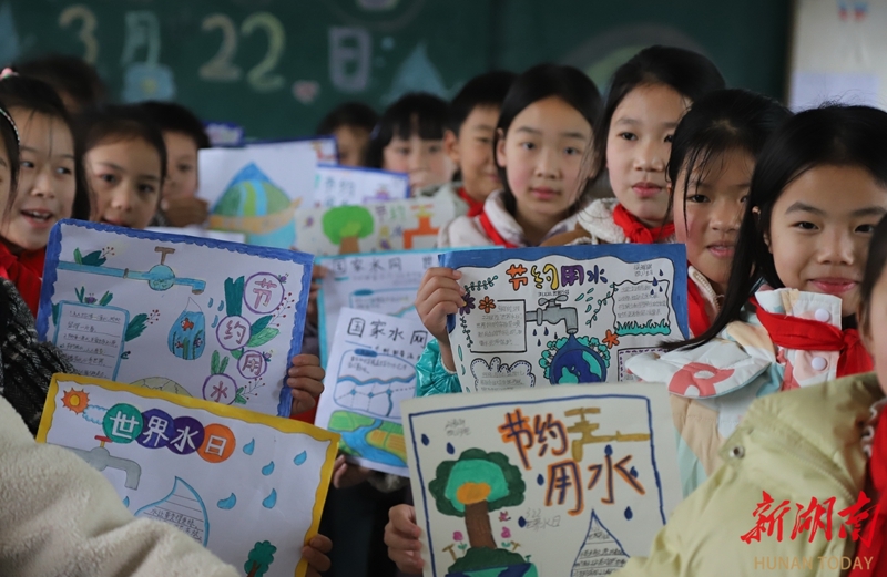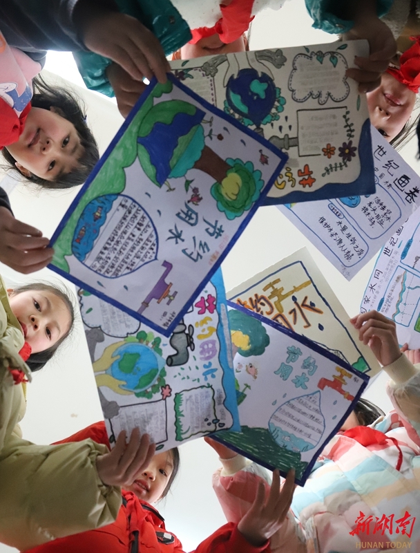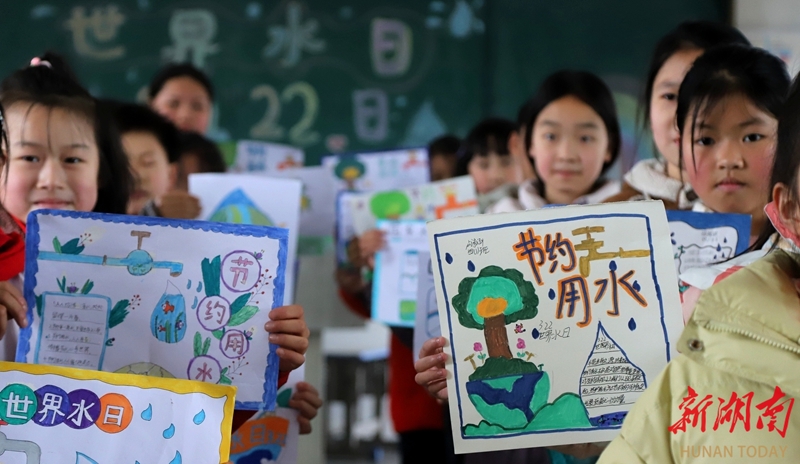 3月20日,涟源市桥头河镇归盘园学校,学生在展示主题绘画作品。当天,该校开展“节约每一滴水”主题活动,教师通过讲解水资源保护知识,并组织学生创作主题绘画,增强大家节约用水的意识。张扬 李敏 摄影报道(湖南图片库)