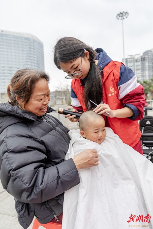 3月20日,吉首市世纪广场,志愿者在为小朋友理发。春分节气,恰逢二月二龙抬头,各地开展丰富多彩的活动,欢庆“双喜临门”。彭璟 摄(湖南图片库)
