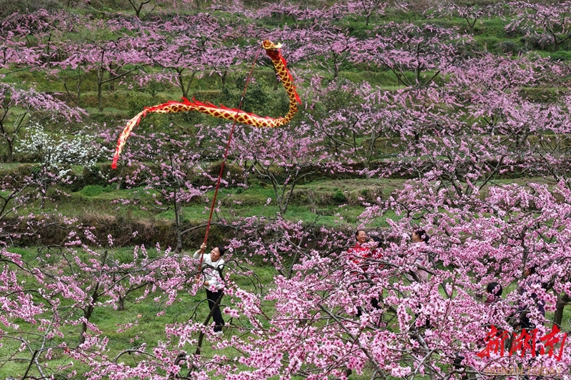 3月20日,桂东县沤江镇坪水村葫芦湾,村民在桃花林舞龙。春分节气,恰逢二月二龙抬头,各地开展丰富多彩的活动,欢庆“双喜临门”。邓仁湘 摄(湖南图片库)