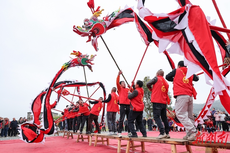 3月20日,临武县花塘乡石门村,村民在舞板凳龙。春分节气,恰逢二月二龙抬头,各地开展丰富多彩的活动,欢庆“双喜临门”。陈卫平 摄(湖南图片库)