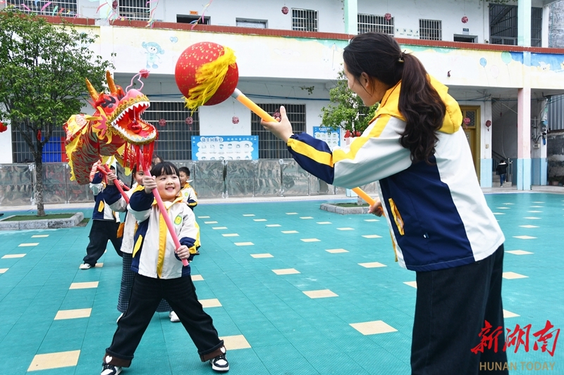3月20日,江永县桃川镇中心幼儿园,老师带领孩子们舞龙。春分节气,恰逢二月二龙抬头,各地开展丰富多彩的活动,欢庆“双喜临门”。田如瑞 摄(湖南图片库)