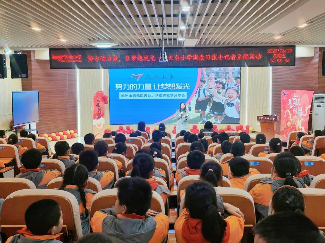 3月20日,株洲市天元区天台小学开展了“努力的力量,让梦想发光”主题教育活动。活动特邀全国三八红旗手、株洲市水务集团排水公司环境质量监测高级工程师、株洲市妇联巾帼讲师团成员张婧与同学们面对面交流,讲述她扎根基层、追逐梦想的奋斗故事。株洲市妇联宣传部部长于展惠、天台小学德育副校长唐婷、德育主任沈漩出席活动,与师生们一同聆听了这场故事分享。