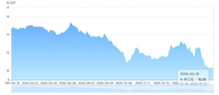 中国养猪网数据显示,截至3月19日,全国外三元生猪价格跌至10.26元/公斤,续创年内新低,年内最大跌幅已接近23%,同比下跌超30%。这一价格水平不仅击穿了行业成本线,更是逼近2018年的历史低值。