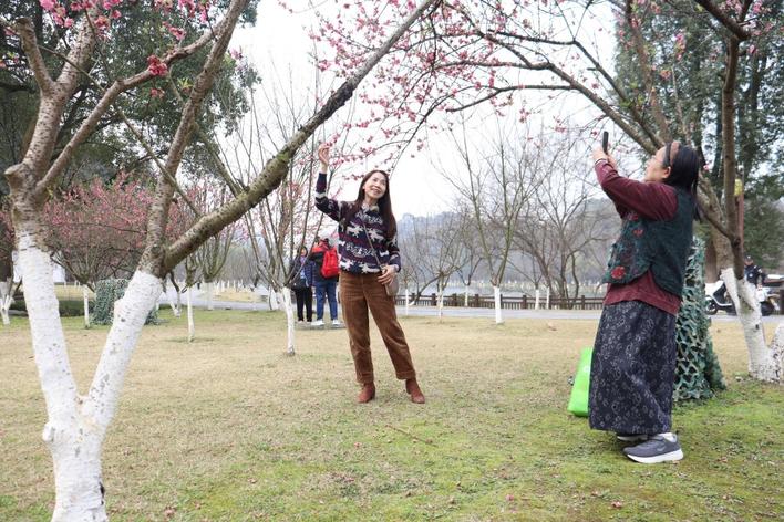 日前,常德市城区穿紫河畔长胜桥附近,数千株美人梅裹满枝丫,市民赏花拍照,在一起的时光比花更甜。 蔡文龙 摄