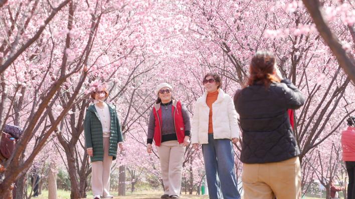 3月11日,常德市柳叶湖旅游度假区语言广场周边,成片桃花竞相绽放,引来市民游客踏青赏花。刘颂 摄