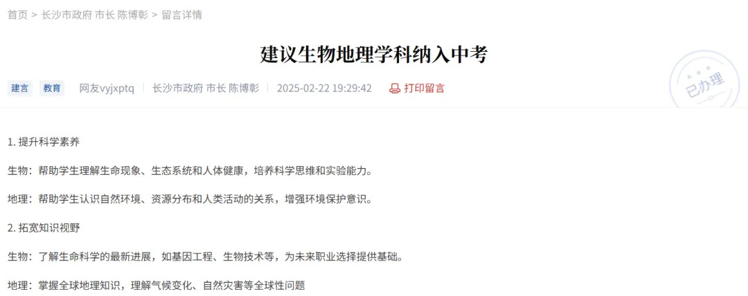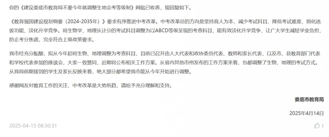 2025年3月,江西赣州市教育考试中心也收到了一则关于地理生物不再计入中考总分的建议。