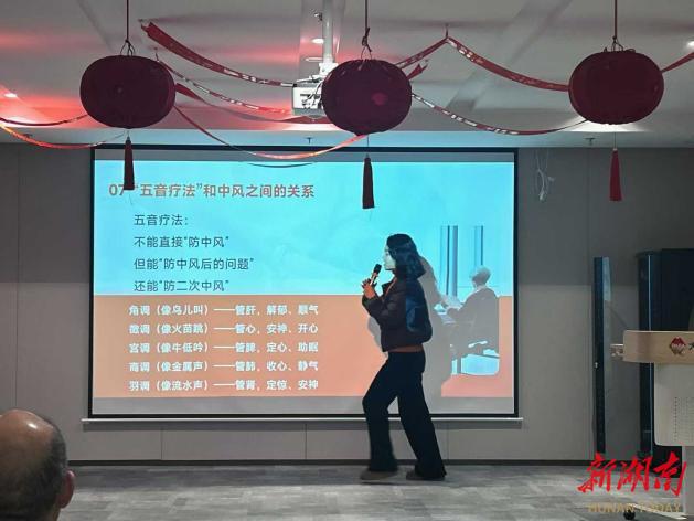 活动现场,暖意融融、氛围温馨,社区活动室内整齐摆放着座椅,长者们早早到场,脸上满是期待。音乐疗愈讲座环节,湖南信息学院的专业老师雷雅婧结合长者的身心特点,用通俗易懂的语言,生动讲解了音乐疗愈的基本原理与实践方法。雷雅婧重点介绍了舒缓旋律对缓解情绪、激活记忆、改善睡眠的积极作用,还分享了相关研究数据:经常聆听舒缓音乐,不仅能有效降低老年人痴呆风险,还能促进大脑多巴胺释放,帮助缓解焦虑、低落等负面情绪,是守护长者认知健康、调节身心状态的“温柔利器”。讲解过程中,老师还现场播放了多首经典舒缓的轻音乐,引导长者们闭上眼睛,跟随旋律调整呼吸、放松肌肉,手把手教大家简单的音乐互动技巧,如跟着节奏拍手、轻哼旋律,让长者们在轻松愉悦的氛围中,学会用音乐调节身心,感受旋律带来的治愈力量。