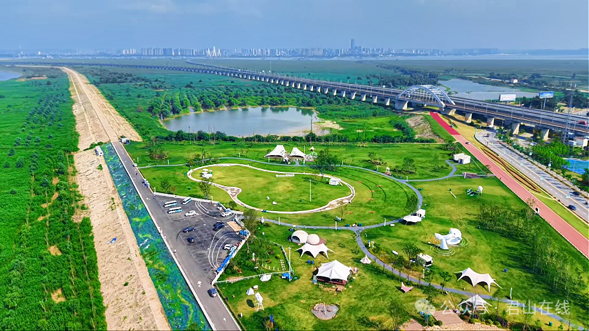 △江豚湾景区——微笑绿洲生态露营基地。昔日的工业用地被逐渐“擦干净”,在曾经机器轰鸣的地方,如今有了浪漫的名字——“微笑绿洲”:草坪绿得发亮,孩子追着风筝跑,三五好友围炉煮茶,微风拂过,草木香味沁人心脾,城市的烟火气在乡村草地上重新燃起。
