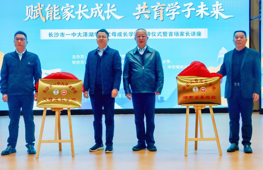 在热烈的掌声中,李晓云、阳彪、陈超平、任军共同揭牌,红绸落定,长沙市一中大泽湖学校父母成长学院正式成立,开启了学校家校社协同育人的全新篇章。这块沉甸甸的牌匾,既是家校同心、携手育人的坚实纽带,更承载着学校推动家庭教育发展、助力区域教育提质的使命与担当。
