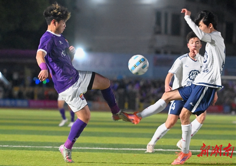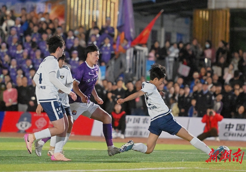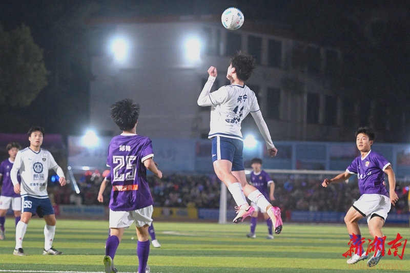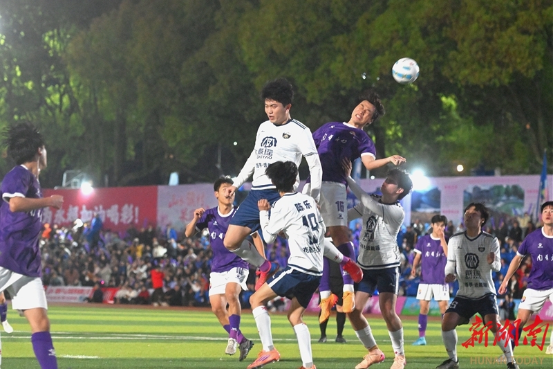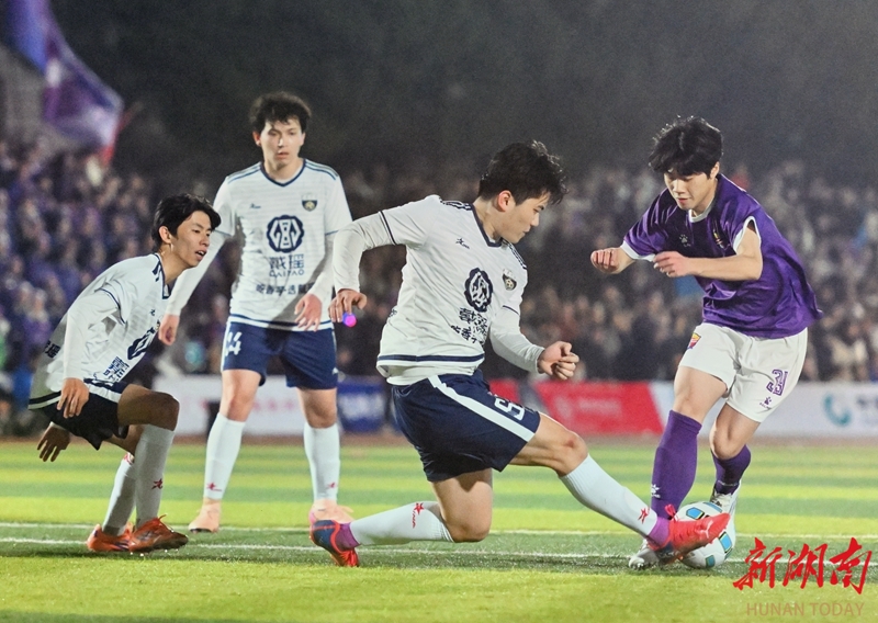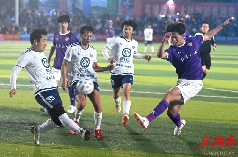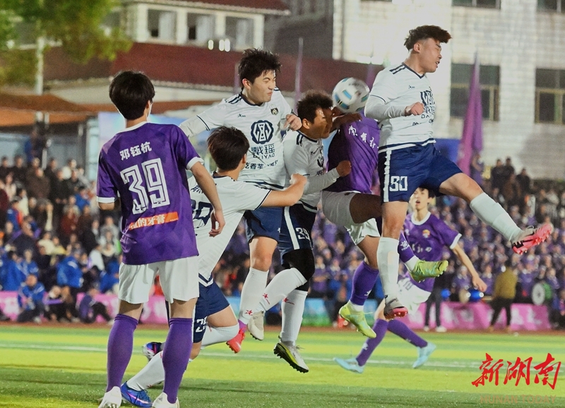3月21日晚,南有新田队(紫)和江永戴瑶队(白)球员在场上展开激烈拼抢。最终,南有新田队以1比1战平江永戴瑶队。当天,2026永州市足球超级联赛揭幕战在新田县二中体育场打响。作为永州足球史上规模最大、覆盖最广、参与人数最多的一次盛会,本届永超联赛首创“县市区组+俱乐部组”双轨并行赛制,集结26支劲旅,实现全市11个县市区全覆盖,点燃全城足球热情。湖南日报全媒体记者 郭立亮 通讯员 钟伟锋 摄影报道