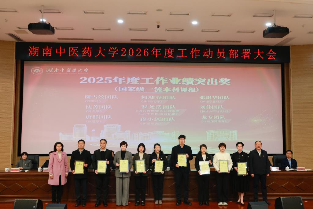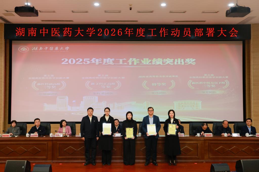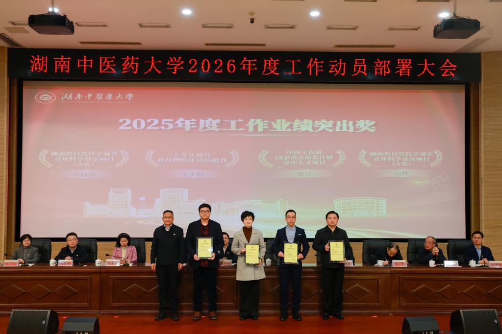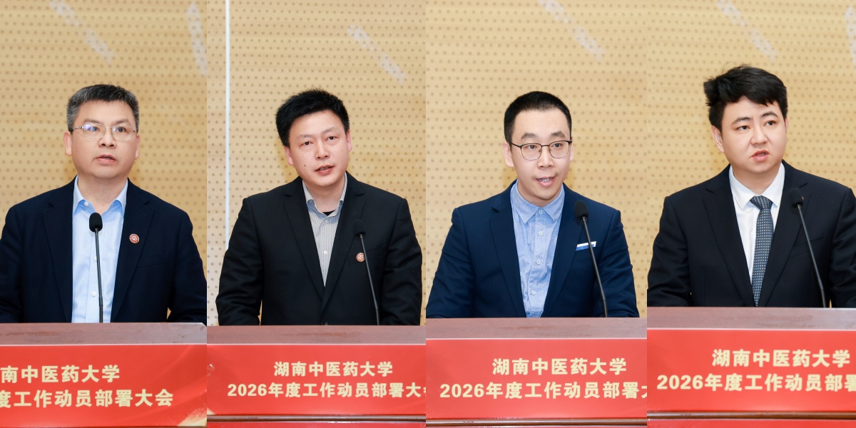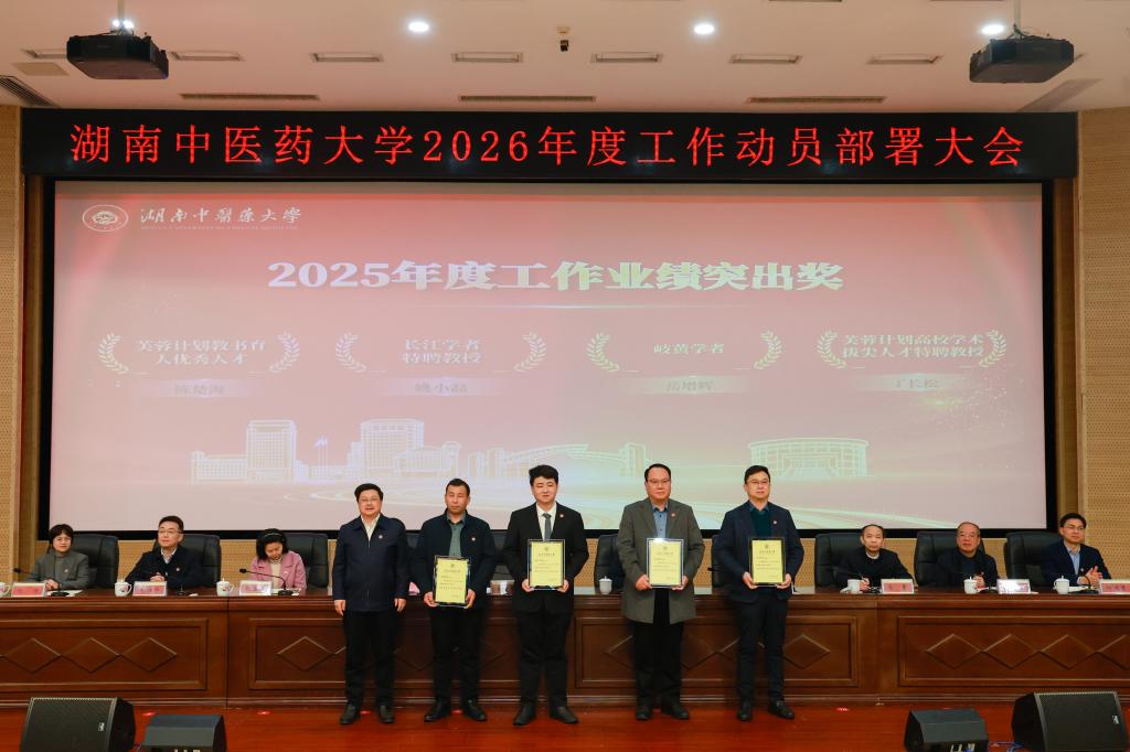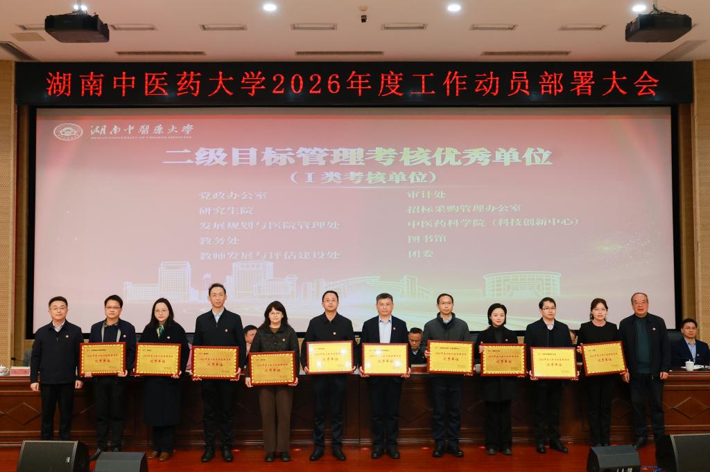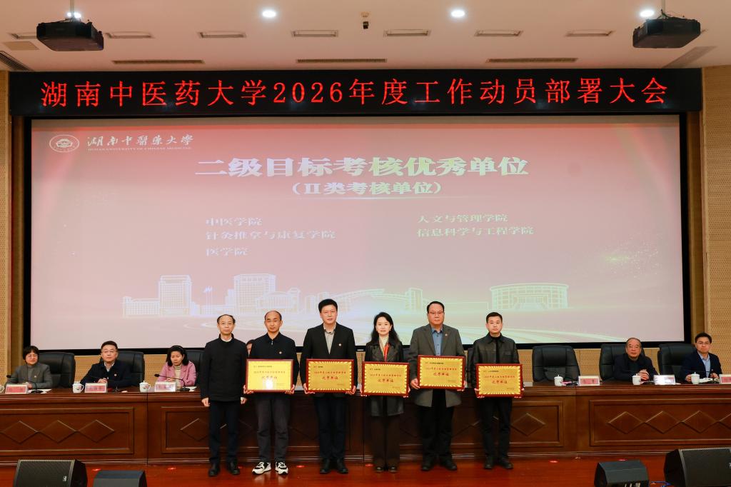 为总结成绩、表彰先进,全面部署2026年学校各项工作,奋力推进事业高质量发展,3月20日上午,湖南中医药大学2026年度工作动员部署大会在济世楼一楼学术报告厅召开。党委书记戴爱国讲话,校长易刚强主持会议,党委副书记汤文胜宣读表彰决定,校领导刘鸿翔、张玉芬、廖菁、刘红华、刘富林、喻嵘、陈鸿君出席会议。