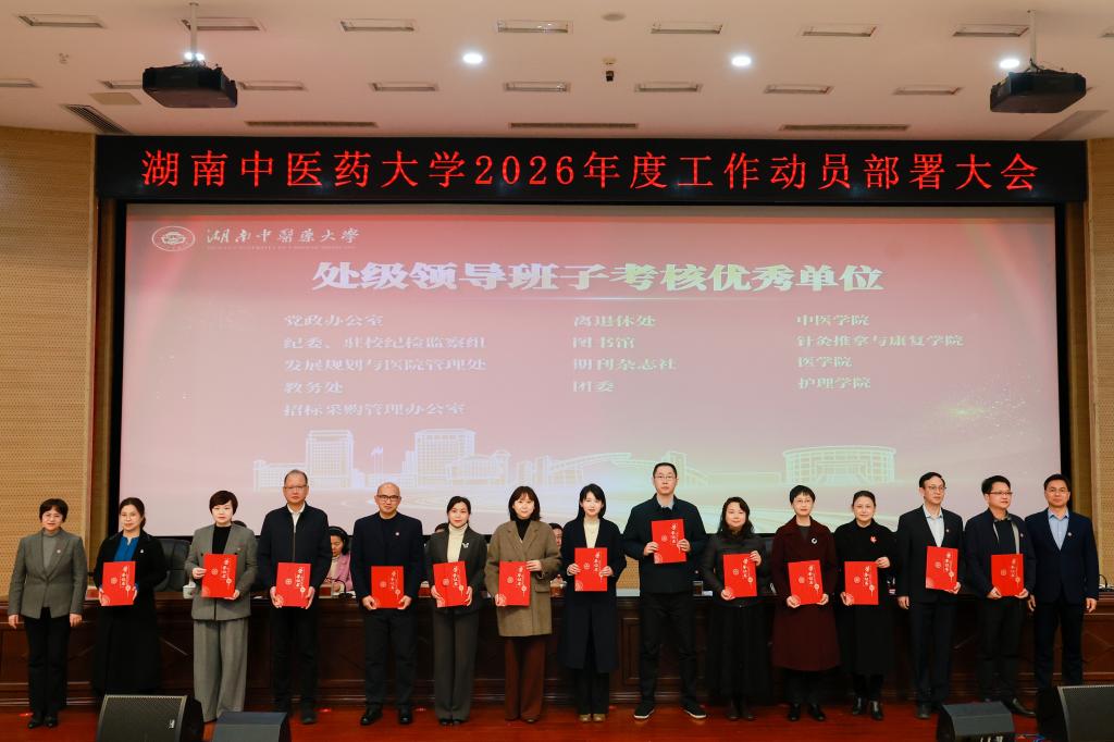 戴爱国指出,2026年是中国共产党成立105周年,是“十五五”规划开局起步之年,也是学校改革突破的关键之年。围绕全年重点任务,他提出三点要求:一是要以昂扬奋进的姿态破难题、开新局。要坚定乘势而进的信心,巩固“十四五”期间形成的“八个更”良好态势;保持直面问题的清醒,正视与顶尖院校的差距,强化“不进则退、慢进也是退”的危机意识;把握大有可为的机遇,主动对接国家战略和地方急需,在政策红利中抢占先机。二是要以精准务实的举措破难题、开新局。在推进健康中国建设上彰显优势,坚持人民至上、坚持中医药特色、坚持中西医并重,擦亮“湘中医”品牌;在办好人民满意的教育上提升内涵,实施新时代立德树人工程,完善五育并举体系,推动高等教育提质扩容;在学校高质量发展上真抓实干,深化教育科技人才一体改革,做好专业认证、创新创业、附属医院建设等工作,全力争取“双一流”建设和学位授权点新突破。三是要以正确的政绩观破难题、开新局。坚持实干实绩导向,各单位目标任务书是必须完成的军令状;保持久久为功韧劲,攻坚办学空间不足、学科建设瓶颈等“硬骨头”;坚守从严从实要求,把立德树人作为根本政绩,以整改实效凝聚发展合力。