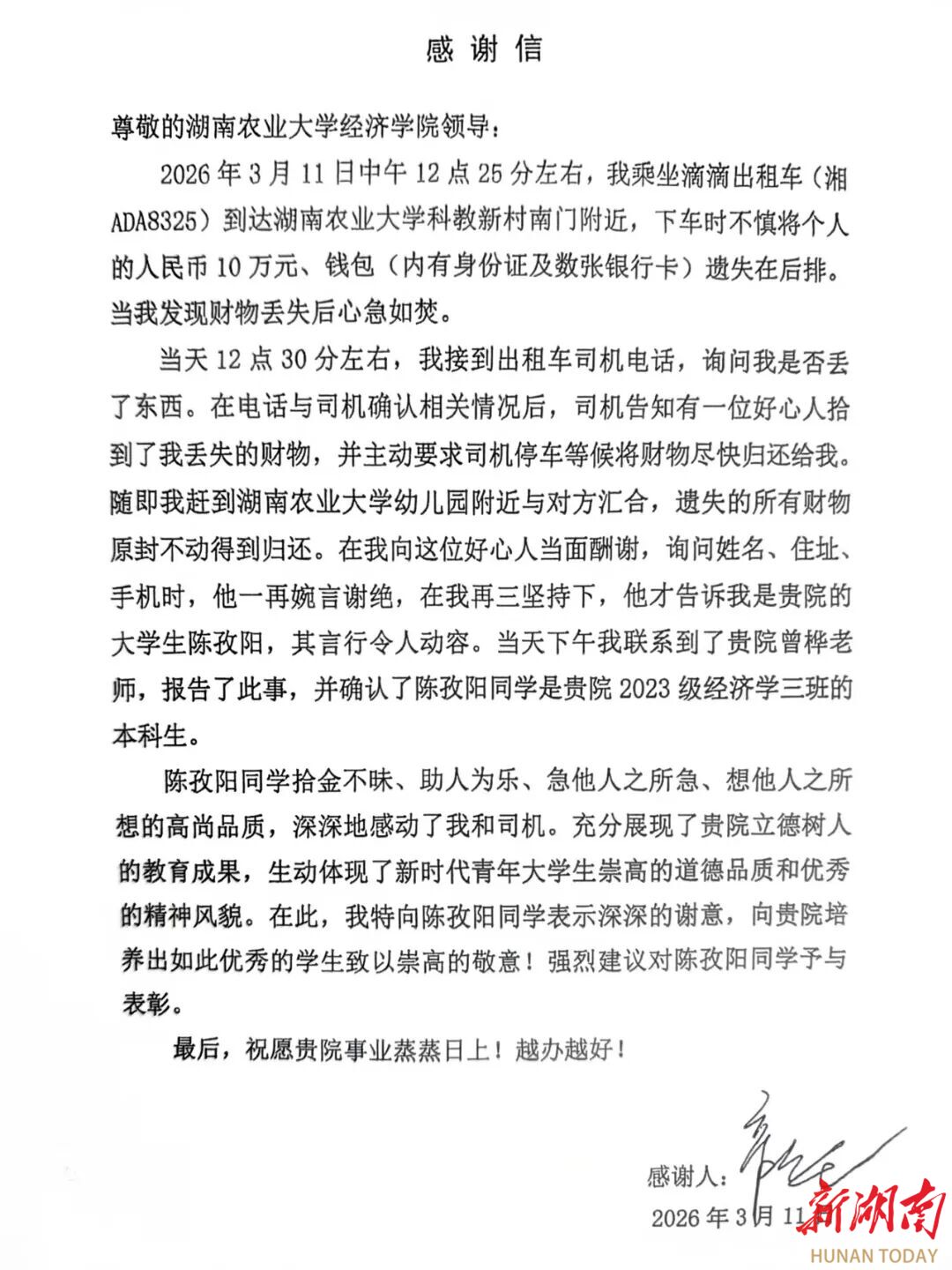 湖南日报·新湖南客户端3月22日讯(通讯员 曾炜煜 李嘉仪)“祁东籍好人多。捡拾10万元现金不动心,当面退还失主。”今天,湖南农业大学经济学院团委负责人打电话给祁东县团委,点赞学院2023级经济学专业3班本科生陈孜阳。