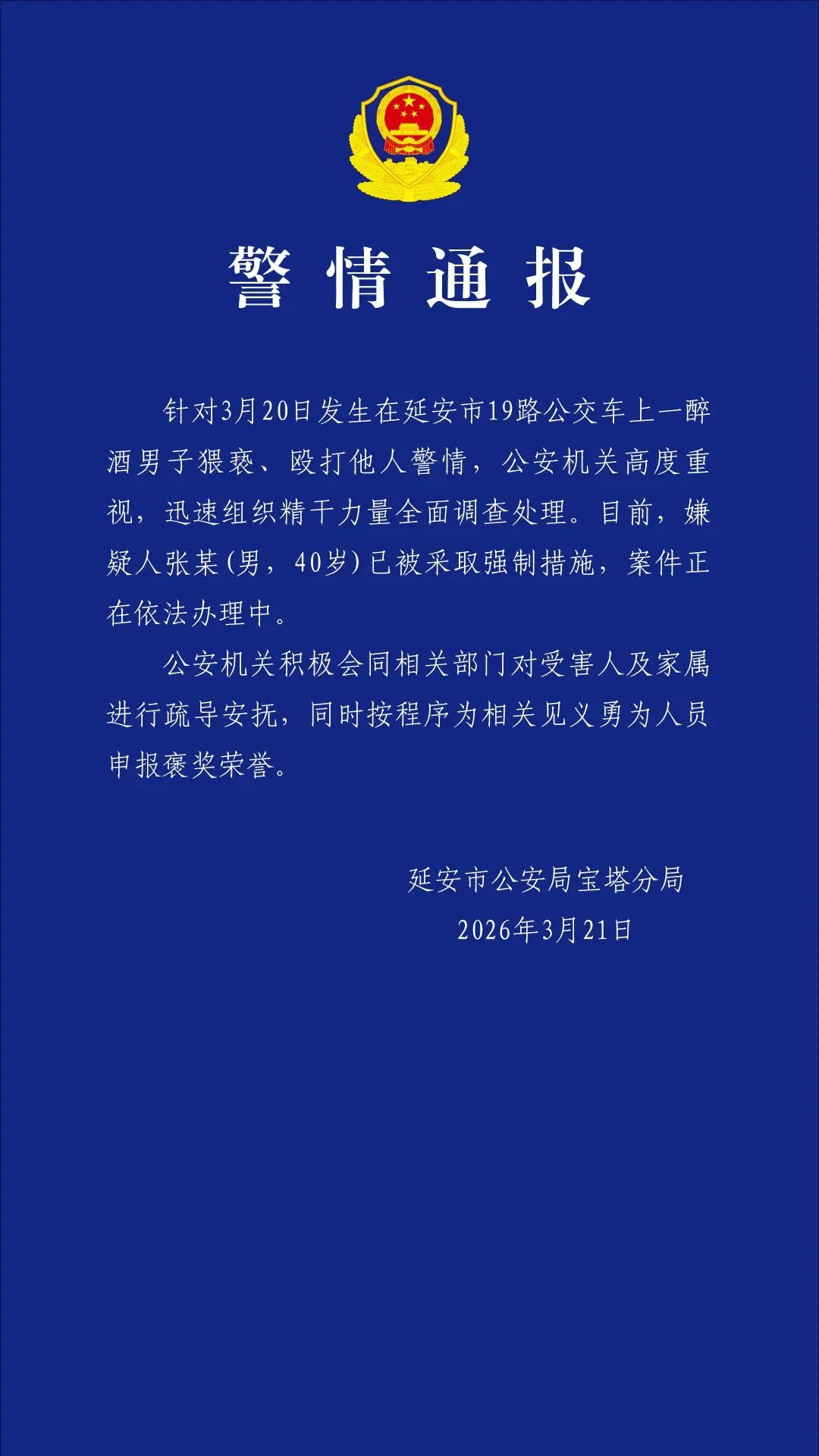 针对3月20日发生在延安市19路公交车上一醉酒男子猥亵、殴打他人警情,公安机关高度重视,迅速组织精干力量全面调查处理。