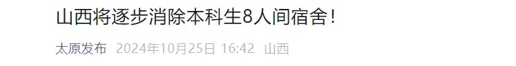 《山西省高校学生宿舍建设方案》明确,5年内基本缓和高校学生宿舍供需矛盾,逐步消除全省高校本科生8人间,显著降低本科生6人间、硕士研究生和博士研究生4人间占比。