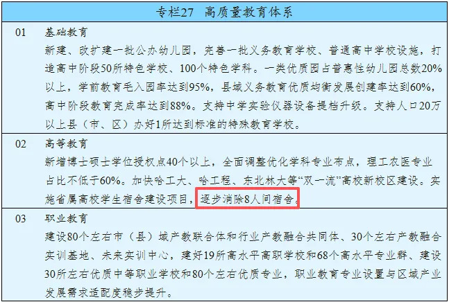 其中提到:“实施省属高校学生宿舍建设项目,逐步消除8人间宿舍。”