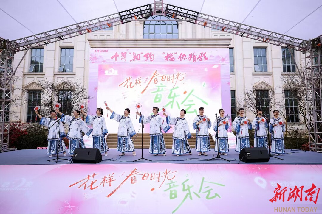 樱花树下,乐动春光。启动仪式后,“樱”乐合鸣·晚安春光音乐会率先开演,经典旋律与漫天樱舞交织,成为现场最动人的风景。“樱花树下听老歌,祖孙三代一起唱,这样的春日体验太美好了。”岳麓区市民王女士带着父母和孩子参与活动,满脸笑意。