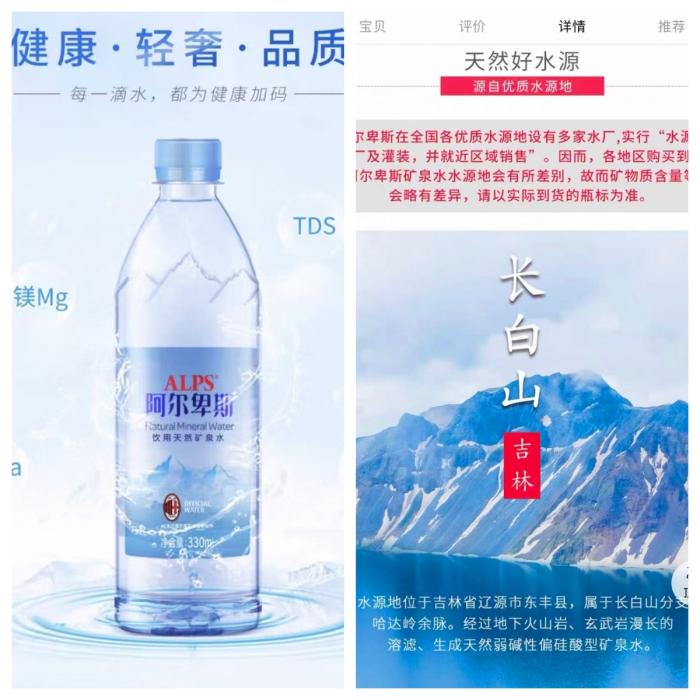 近日,有媒体报道称,一款名为“ALPS阿尔卑斯”的饮用天然矿泉水,其实际水源地却是国内江西萍乡、吉林辽源等地。