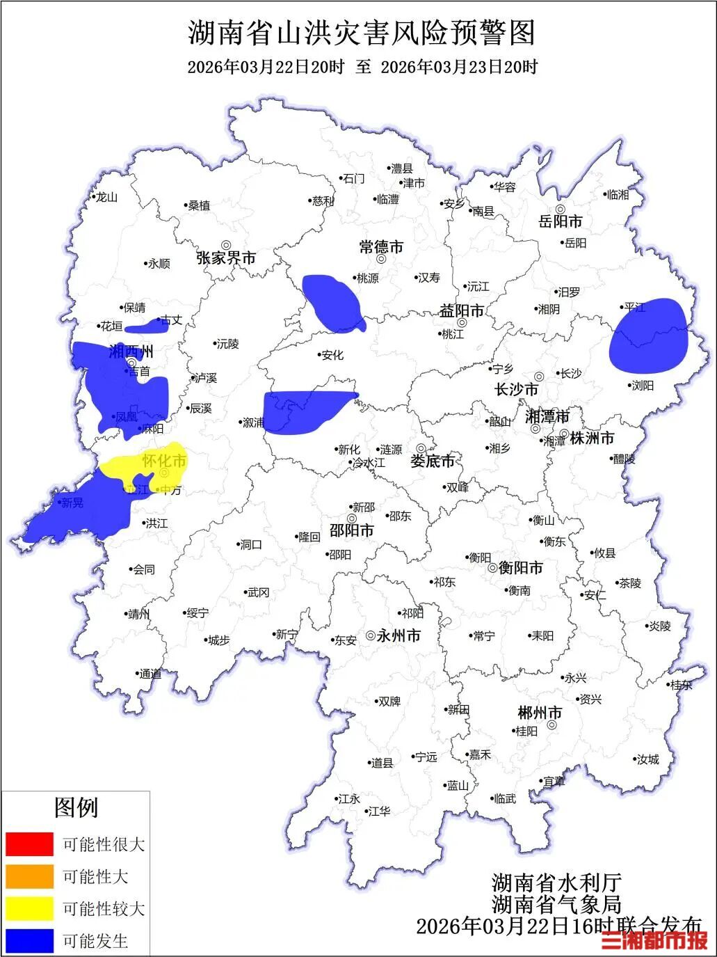三湘都市报·新湖南客户端3月22日讯(全媒体记者 李致远)根据省气象局3月22日预报,省水利厅与省气象局联合会商得出如下结论:受降雨影响,22日20:00至23日20:00,怀化市、湘西土家族苗族自治州、娄底市、常德市、益阳市、长沙市、岳阳市可能发生山洪灾害,具体如下。