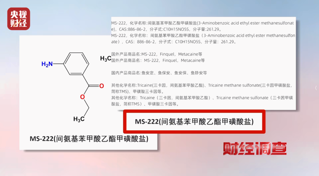 商户向记者展示的MS-222,俗称甲盐,化学名间氨基苯甲酸乙酯甲磺酸盐,为白色结晶粉末,对鱼类有麻醉作用。