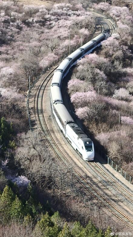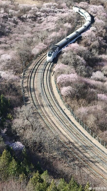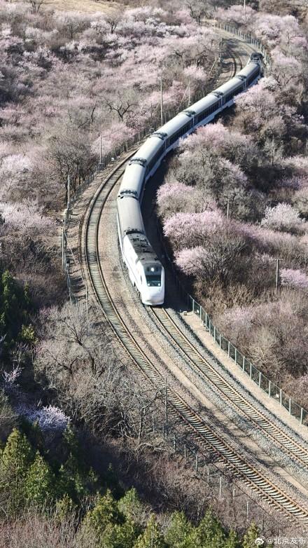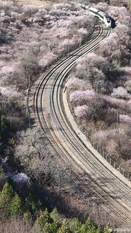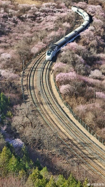 3月22日,北京,居庸关长城脚下的山桃花盛开成海。S2线列车哐当哐当穿过花海,这不是电影截图,是北京春日限定款浪漫!开往春天的列车已发车,这波颜值谁顶得住啊!