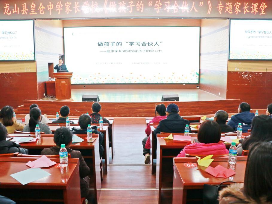 新湖南客户端3月23日讯(通讯员 彭吉山 杨艳 黄旖旎) 3月20日,湖南省湘西土家族苗族自治州龙山县皇仓中学报告厅内,高一、高二年级200余名家长齐聚一堂,参加家长学校举办的《做孩子的“学习合伙人”》主题育人活动。龙山县家庭教育指导服务协会会长朱振华,县心理咨询师协会会长梁强、秘书长田奎等应邀出席。本次活动由皇仓中学副校长向立统筹指导,女生部负责人欧阳洁主持,华鑫教育集团心育中心主任肖建国主讲,皇仓华鑫学校小学部德育主任欧阳捷现场观摩。