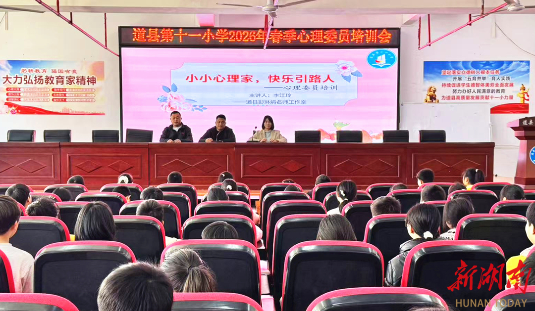 道县第十一小学开展“小小心理家,快乐引路人”2026年春季心理委员培训。会上,该校党支部书记、校长成求良以《当好心灵守护者,争做阳光小使者》为题,对学生心理委员提出“做乐观向上的小榜样”“做耐心倾听的小伙伴”“做善于发现的小观察员”“做传递温暖的小卫士”要求,同时希望教师们重视心理委员队伍建设,多指导、多鼓励、多支持,守护学生心灵成长。