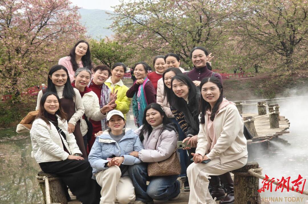 午后,大家转场至常宁百万樱花园,开启赏花之旅。园内5600余亩土地上,百万株樱花正值盛放期,台湾山樱、牡丹樱等品种交织成海,红的似火,粉的如霞。微风拂过,花瓣如细雨般飘落,令人宛若置身童话世界。教师们三五成群漫步花间小径,或驻足观赏,或拍照留念,笑脸与娇艳的樱花交相辉映,平日工作的疲惫尽消。