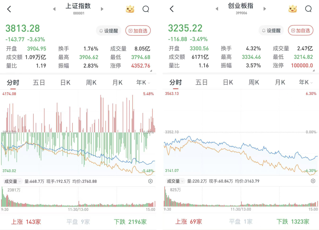 至收盘,上证综指跌3.63%,报3813.28点;科创50指数跌4.31%,报1261.44点;深证成指跌3.76%,报13345.51点;创业板指跌3.49%,报3235.22点。