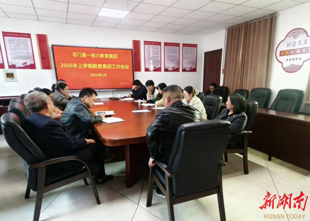 科教新报·新湖南客户端讯(通讯员 马春芳 覃业彦)3月20日,石门县一完小教育集团召开2026年上学期工作部署会。石门县教育局教研室教研员周崇山、集团牵头校石门县第一完全小学及六完小、夹山镇完小、蒙泉镇花薮完小、白云镇完小、壶瓶山镇完小等成员校领导齐聚一堂,共商新学期集团发展大计。