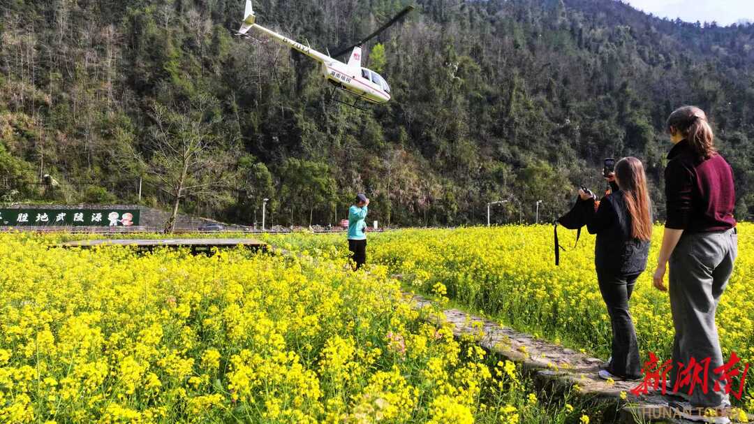 与此同时,黄龙洞景区直升机游览项目备受青睐。游客乘直升机升空,360度俯瞰峰林、花海与田园风光,以全新视角感受张家界春日之美,空中游览成为春季热门打卡体验。眼下正值黄龙洞广场最佳赏春期,花海与溶洞、空中游览联动,丰富了旅游产品供给,持续擦亮张家界春季旅游品牌,助力入境游市场稳步增长。