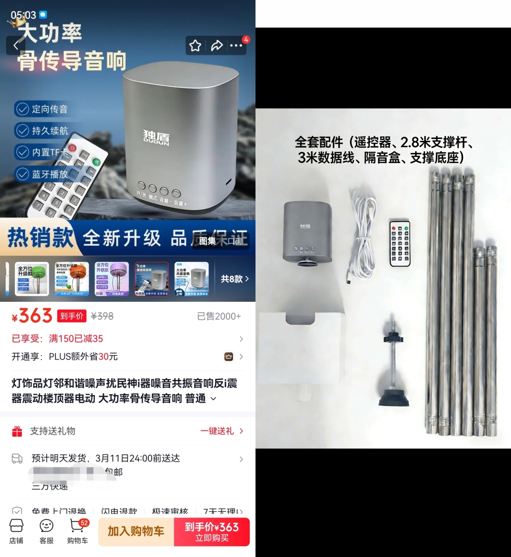 京东平台的独盾影音经营部,首页直接展示了震楼器的实测效果,工作人员在楼下用撑杆将震楼器顶在天花板上,然后到楼上听,声音明显比楼下大很多。独盾牌骨传导音响作为震楼器升级版,价格更贵,音响放在桌面,可以让桌面上的豆子跳动。客服还介绍,音响传导给邻居家是45~80分贝,而自己家的音量可在1~100分贝内调节。