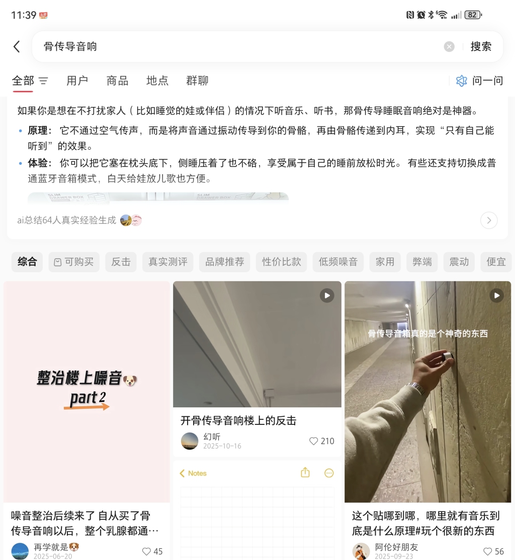 如在小红书上,多篇笔记内容为“噪音整治后续来了,自从买了骨传导音响以后,整个乳腺都通了……震了楼上一夜,终于忍不住开始在物业群反馈了。既然你的孩子赤脚跑跳不让我们家好过,那就都别睡。”此外,售卖“猛牙骨传导音响”“美对音响”的商家,也在小红书进行推广。