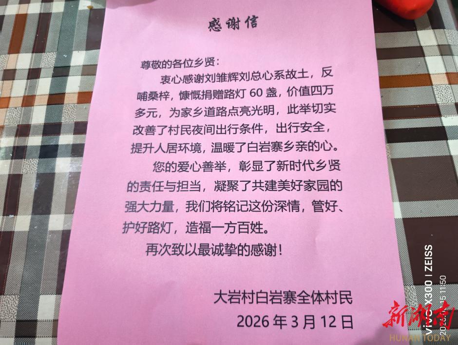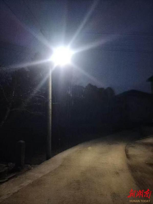 新湖南客户端3月23日讯(通讯员 孟飞扬)近日,新化县孟公镇大岩村白岩寨片的乡亲们迎来了一件暖心事:由该村乡贤、中山市荣谷电子科技有限公司总经理刘雏辉出资4万余元捐建的太阳能路灯全线亮灯,昔日夜间漆黑泥泞的村道,如今被一盏盏温暖的灯光点亮,照亮了乡亲们回家的路,也映照出乡贤反哺桑梓的赤子情怀。