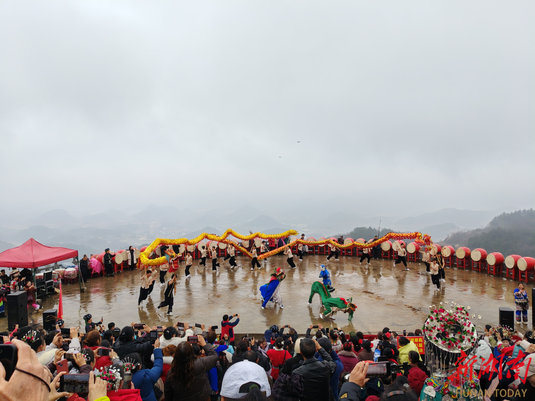 上午十时,铿锵有力的《热场鼓》声划破雨雾,文艺表演正式开启。在简短的致辞后,开幕式在礼炮声中迎来高潮。凤凰县苗学会鼓舞队率先登场,献上激昂的《祭祖鼓》。鼓点雄浑厚重,身着盛装的鼓手们每一次奋力击打,都仿佛在叩响历史的大门,表达着对始祖蚩尤开疆拓土、披荆斩棘精神的无限敬仰。紧随其后,吉信武术学校的少年们舞动双龙,带来节目《龙腾盛世》。两条金色长龙在少年们手中翻腾飞舞,气势如虹,不仅展现了力与美的交融,更寄托了苗族同胞对民族活力永续、生活繁荣昌盛的热切期盼。