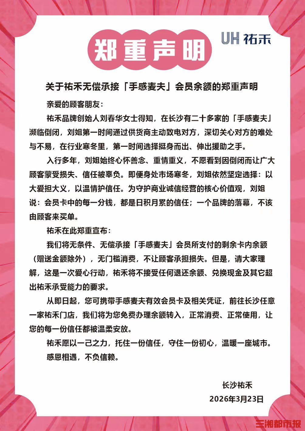 近日,一则“祐禾无偿承接手感麦夫会员余额”的消息在长沙市民的社交平台刷屏,让众多手握手感麦夫储值卡却面临余额无法使用的消费者看到了希望。声明称,消费者可凭有效会员卡及相关凭证前往祐禾线下门店办理余额转入。祐禾真的会兑付“手感麦夫”的会员余额,妥善安放消费者们的信任吗?3月23日,记者进行多方求证。