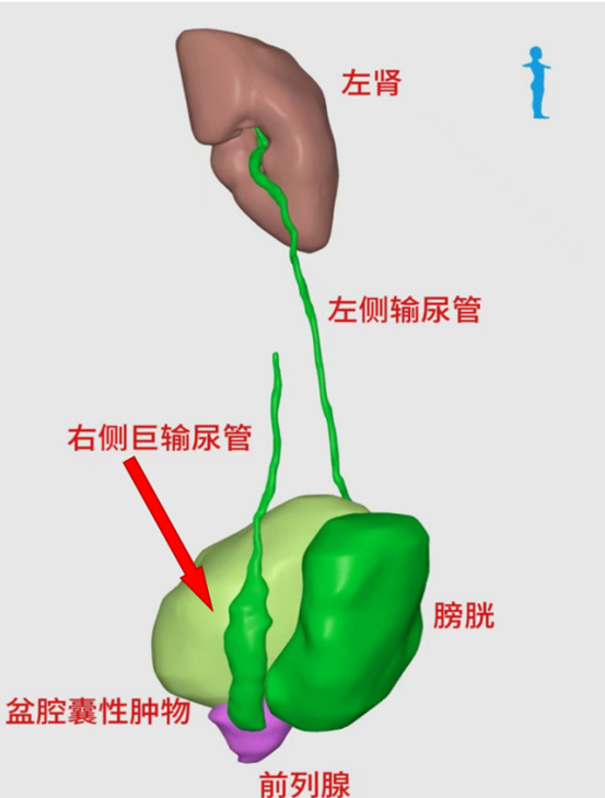 面对这一复杂病例,刘龙飞教授团队为其进行了全面细致的评估。一系列检查后发现,患者同时存在右侧肾缺如、右侧巨输尿管症并异位开口,以及盆腔内一个直径达10厘米的巨大囊性占位。结合无精症的表现,团队最终精准诊断其为罕见的Zinner综合征,盆腔囊肿即为巨大的精囊囊肿。该病由胚胎期中肾管发育异常导致,解剖结构异常复杂,位置深,手术难度极大,对术者要求极高。