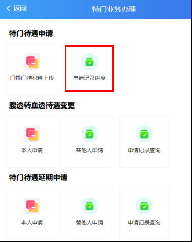5. 在“特门业务办理”页面,点击“申请记录进度”可实时查询待遇评审进度。