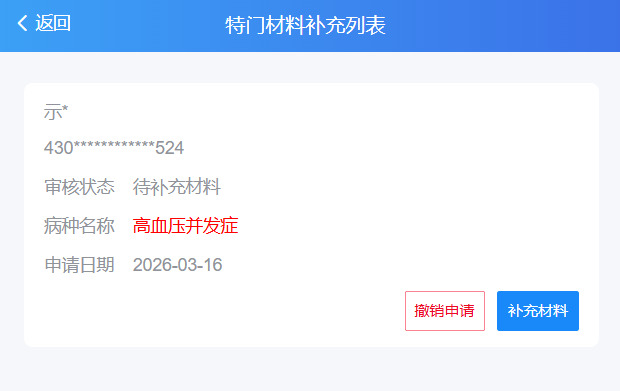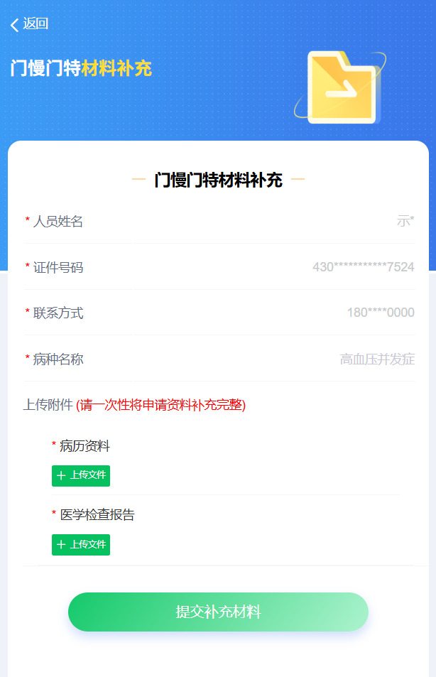 4. 在“门慢门特材料补充”页面,按照页面提示一次性上传病历资料和医学检查报告等补充材料。